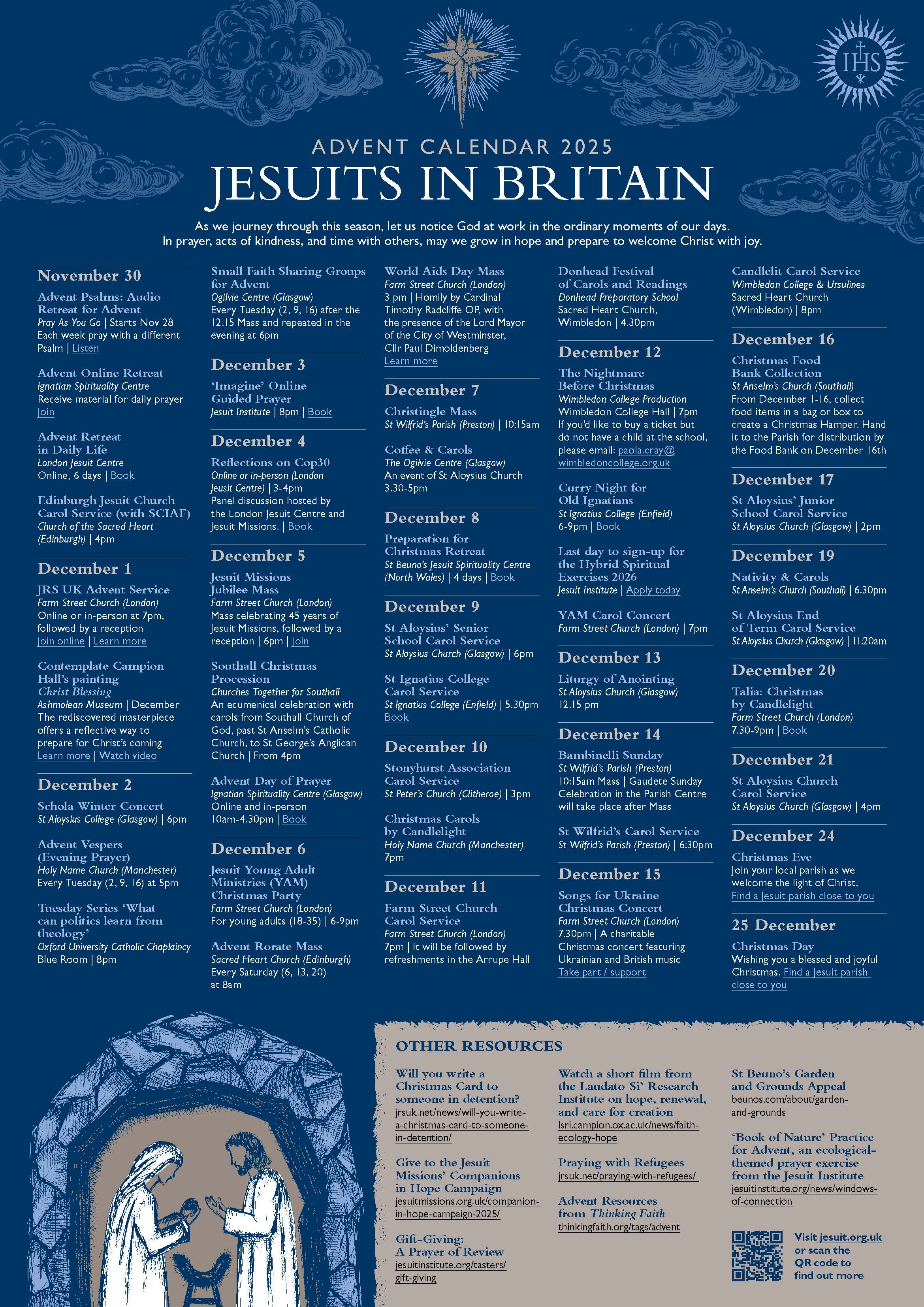 Inside, you will find a daily selection of offerings: carol services and Christmas concerts from Jesuit parishes and schools; Advent retreats and guided prayer resources both online and in person; reflections from our online journal Thinking Faith; invitations to acts of solidarity; and chances to encounter sacred art, youth events, and moments of stillness. Each day opens a door onto something new to accompany you through the season.