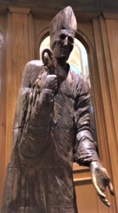 “When I saw his Pietà in York Minster in the early 1980s, I determined that if ever I got the opportunity I’d commission a work from Fenwick,” recalled Fr Denis Blackledge SJ. “My chance came in 1991 at St Wilfrid’s Preston. Fenwick produced a nine-foot elm sculpture of the awkward saint striding on a missionary journey. It’s welcomed folk ever since, and Fenwick loved it to be touched — so Wilfrid’s hand is well rubbed!”