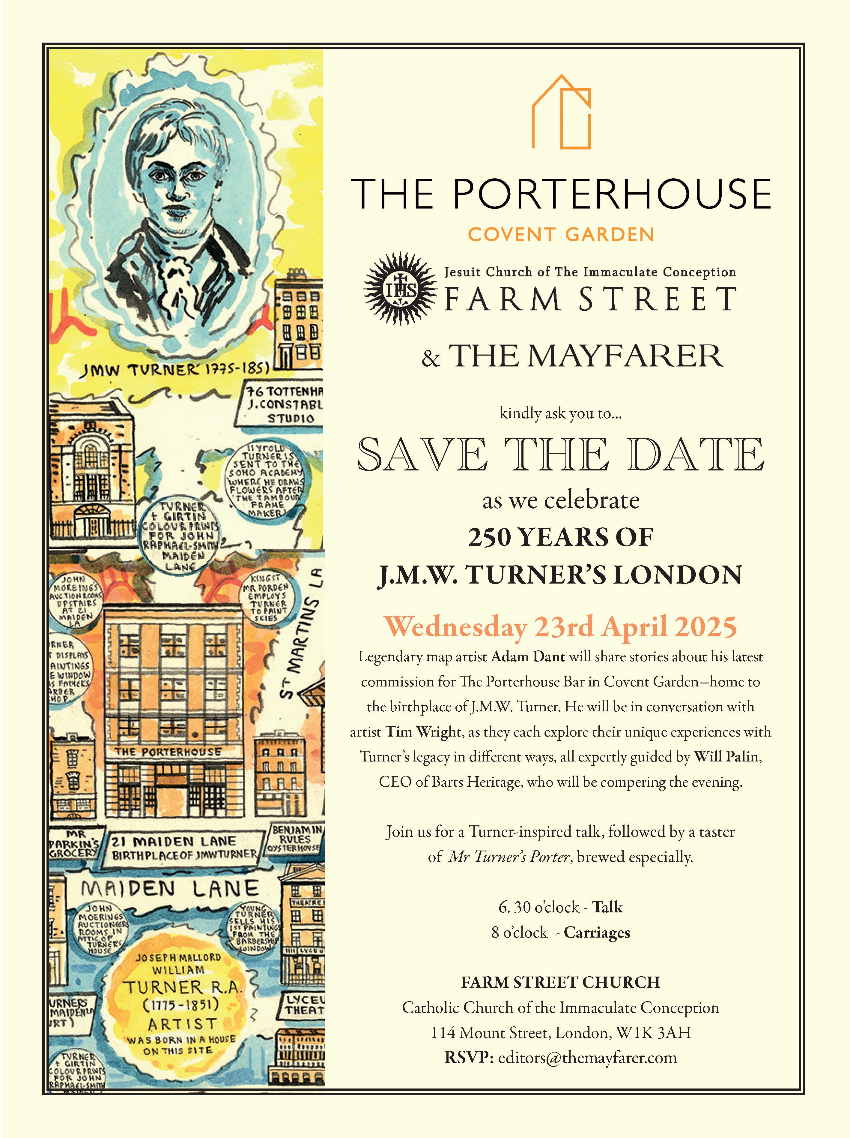 “It’s a great pleasure to host this anniversary celebration of the birth of the great English painter Turner, whose life and work are so resonant with the landscape of the London and England of the age which was to see the restoration of the Society of Jesus and of the Catholic faith. As plans were afoot for the grand project of the building of Farm Street Church, Turner would have been a presence in the surrounding streets and squares as he mingled with the people of the times and gave us a lasting portrait of a city going through epochal change. It’s been a great pleasure to work with Jeanine Saba at the Covent Gardener and Mayfarer, with Adam Dant, with the team at The Porterhouse, and with all involved in the event. Please do come along on St George's Day to learn more and sample some porter too!”
